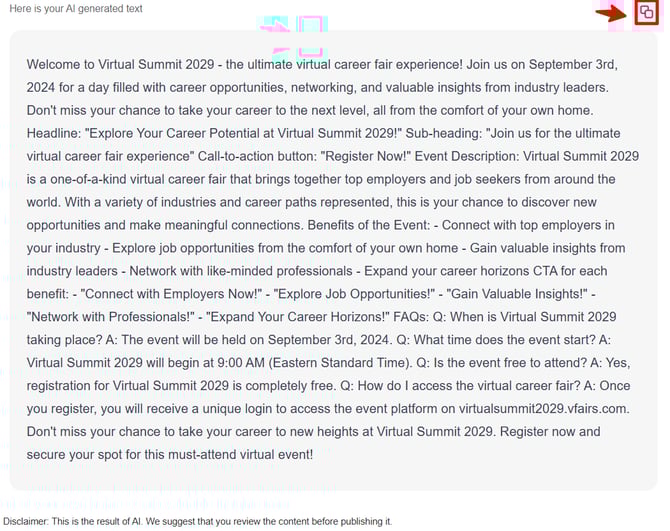 The AI tool successfully generates landing page content based on the selected scope and refinements. Users can efficiently create and apply content that suits their event needs.