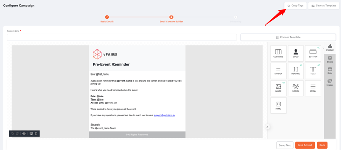 Head over to the Email Campaigns module and click Copy Tags inside the campaign builder.