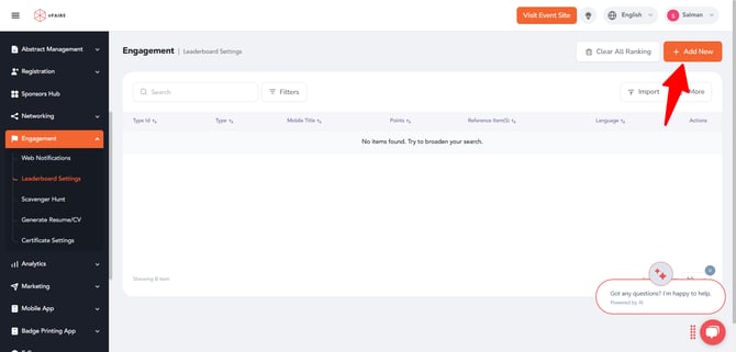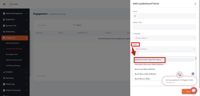 Conclusion: By integrating custom type leaderboard points into your event management system, you can provide a more tailored and engaging experience for participants, enhancing the competitive element of your event and ensuring precise tracking of all interactions.