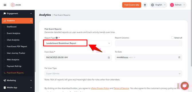 - To download the custom types leaderboard report, click Analytics section in the left navigation menu and then click 'Post Event Report'.
