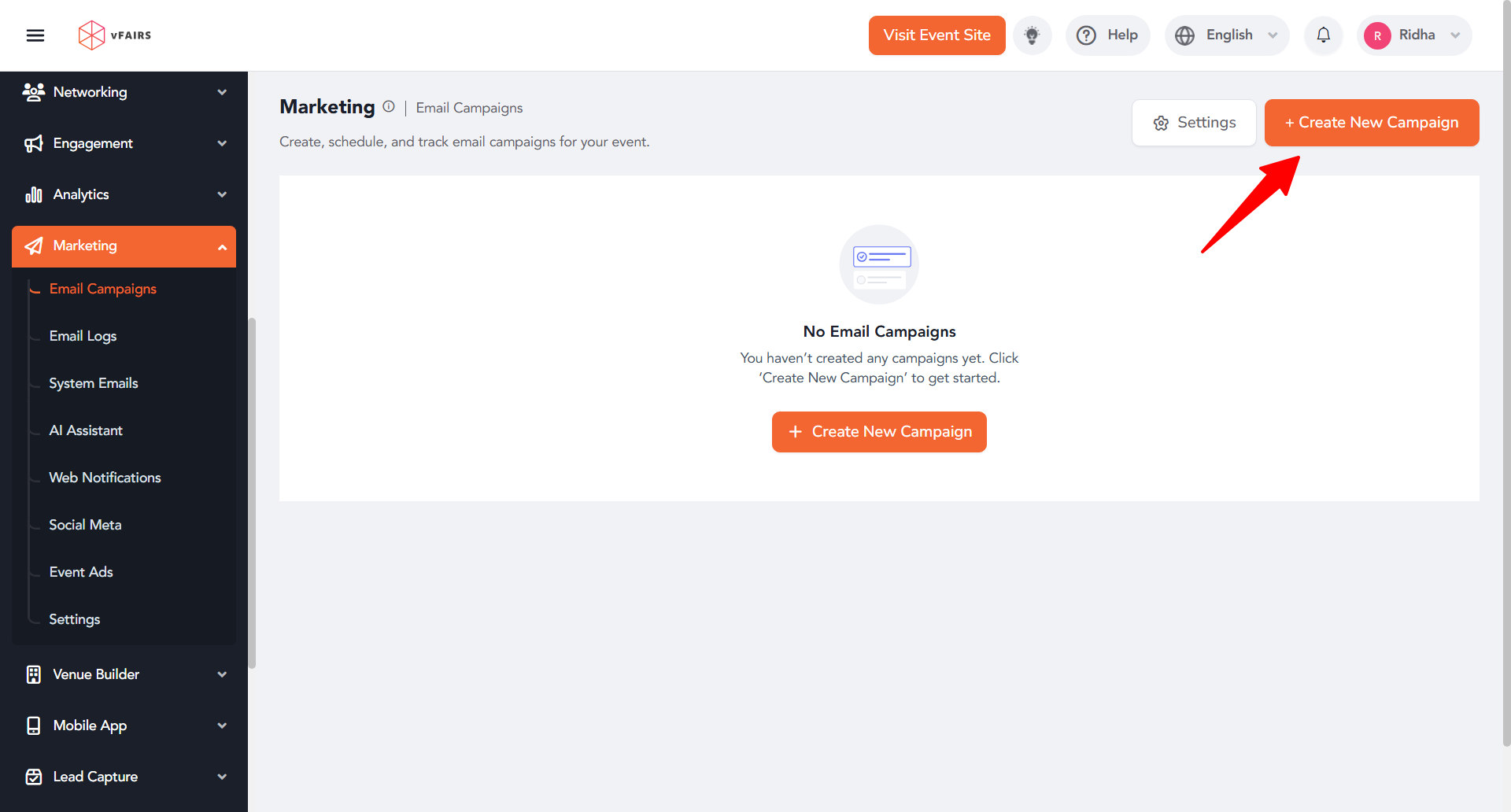 - Click the “+ Create New Campaign” button to start setting up a new email campaign.