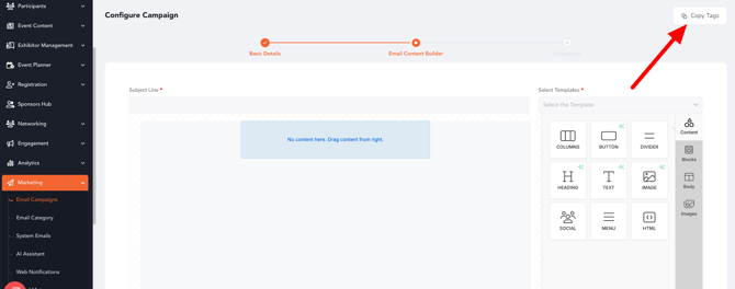 - Fill in the required campaign details such as subject line and template. Once you move to the email builder, click the “Copy Tags” button.