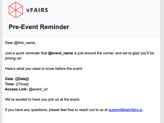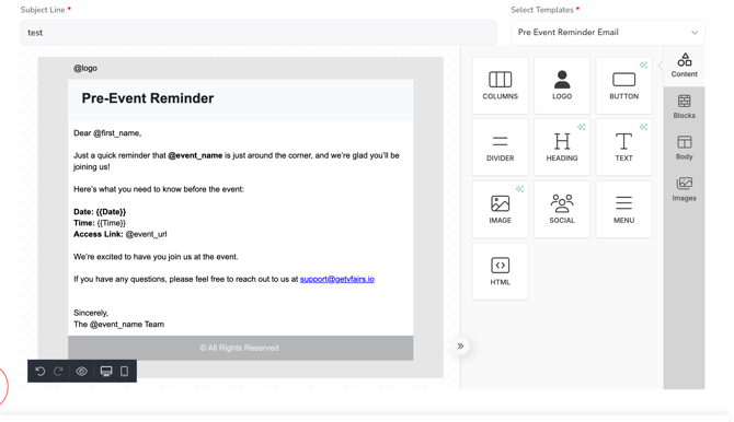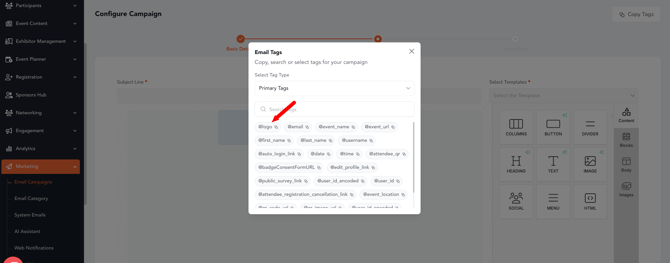 - When the campaign is sent (test or live), the tag will automatically fetch the event’s uploaded logo from Event Settings and render it as an image.